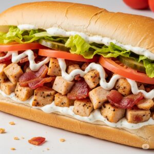 This flavorful sub is a mouthwatering combination of tender chopped chicken, crispy bacon, and creamy ranch dressing, all packed into a soft sub roll.
