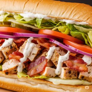 This hearty and delicious sub is packed with tender chopped chicken, crispy bacon, fresh veggies, and creamy ranch dressing, all nestled inside a soft sub roll.
