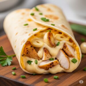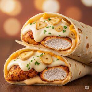 - Assemble the Wraps: Lay the flour tortillas on a clean surface. Evenly distribute the cheesy chicken mixture onto the center of each tortilla. Drizzle the creamy garlic sauce over the filling. Fold in the sides and roll up tightly to secure the filling.