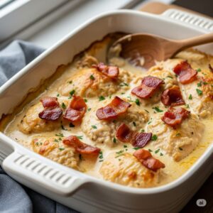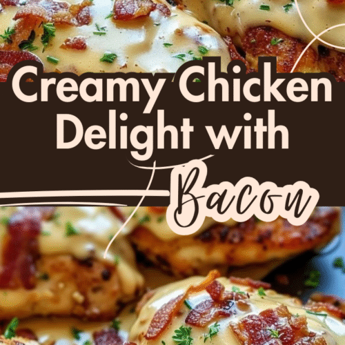 Recipe Description: Creamy Chicken Delight with Bacon is a rich and savory dish featuring tender chicken breasts smothered in a luscious, creamy sauce made with cream, cheese, and herbs. Crispy bacon is crumbled on top, adding a smoky flavor and extra texture. The dish is perfect for a comforting meal that’s easy to prepare yet full of indulgent flavors.