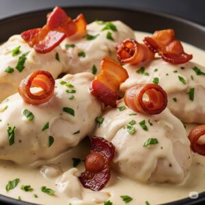 This rich and indulgent dish features juicy, tender chicken breasts paired with crispy bacon and a creamy, flavorful sauce.