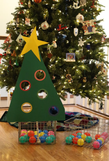 How to Play: Players take turns dropping Christmas ornaments (using their feet!) onto the branches of a Christmas tree. They must aim carefully, as they cannot use their hands. The player who gets the most ornaments on the tree in one minute wins.